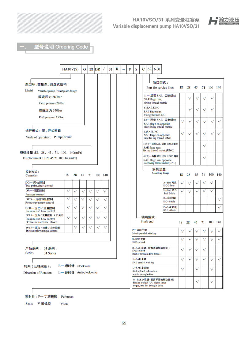 產品型號定義說明;A10VSO系列,排量為45ml/r,DR恒壓控制方式,31系列,R代表正旋,PPA12N00平鍵軸非通軸柱塞泵。